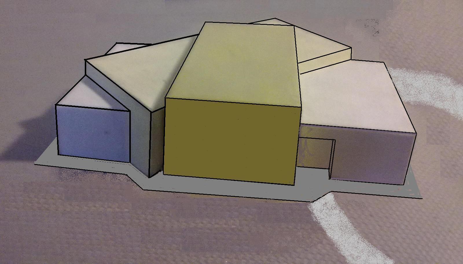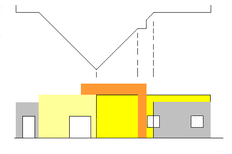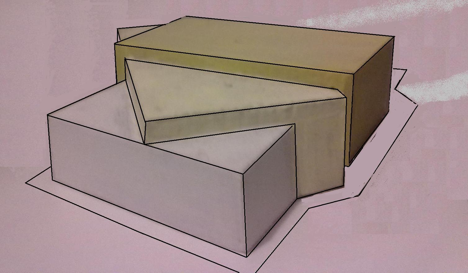 il più piccolo 6 x 12, il mediano 7,5 x 15, il più grande 9 x 18. Anche le altezze sono in progressione aritmetica: 3,20 - 3,70 - 4,20. Il corpo mediano viene ruotato di 45° il più piccolo viene ruotato di 90° entrambi rispetto al centro comune Infine il mediano viene traslato finché il suoi vertici opposti toccano due lati consecutivi del grande |
